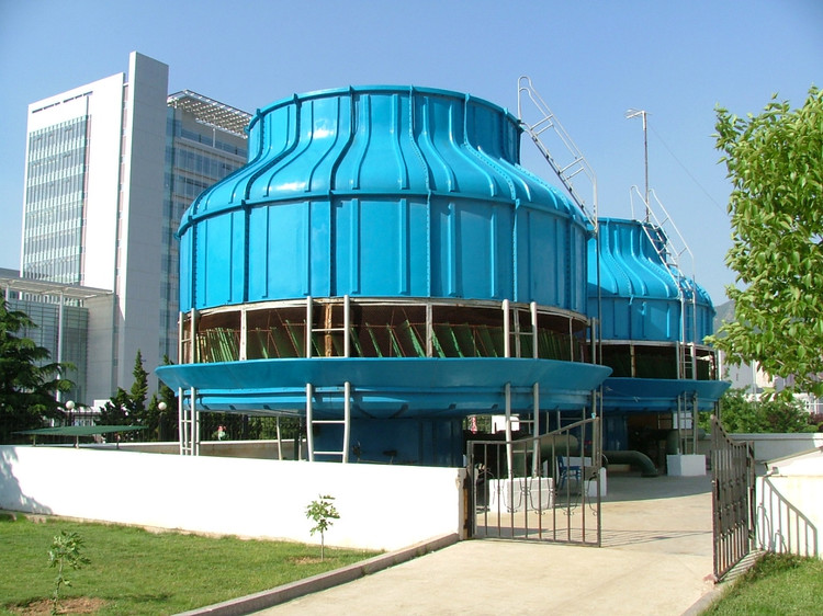 (1)塔體:型線合理,氣流平穩,材質優良,色彩鮮艷,表面膠衣樹脂內含有抗紫外線劑,耐老化,強度高,重量輕,耐腐蝕。下塔體按訂貨要求,可配有溢水、排污、自動給水管,可由此處直接吸水,省去冷卻池,上面裝有防噪消聲墊,有效降低了滴水聲。
