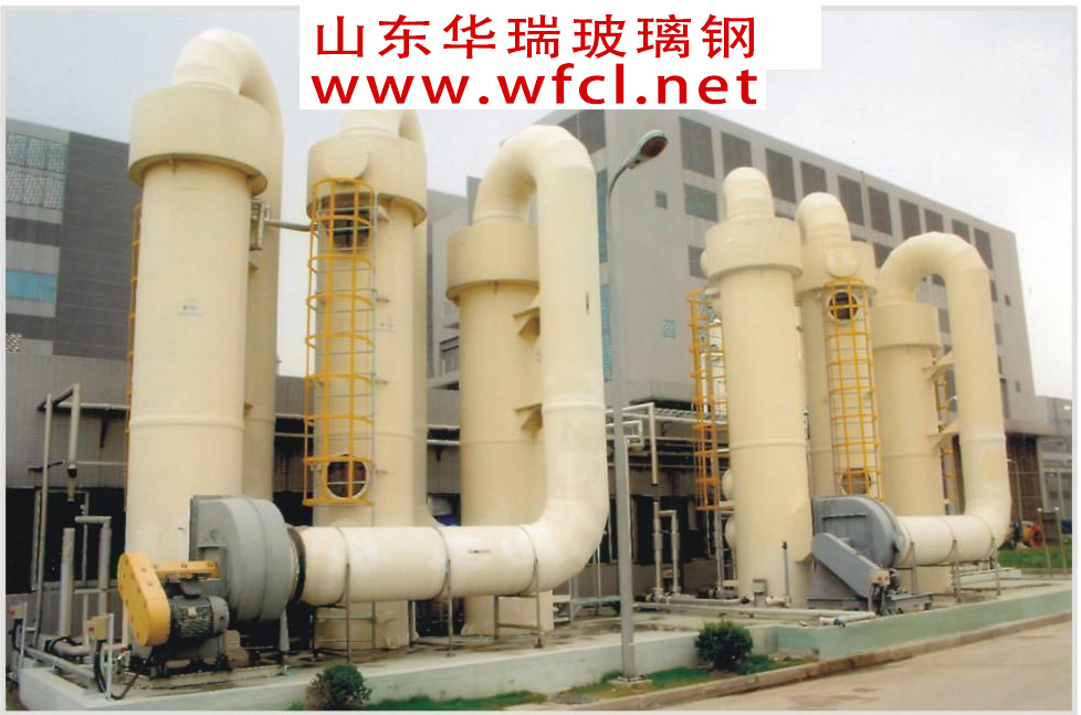 玻璃鋼吸收塔的塔內氣體由風機送入,氣體由下向上。吸收液由耐酸泵打入塔頂通過布液裝置均勻向下噴淋。形成逆流吸收,中合后的氣體經塔內除霧段后,經煙筒排入大氣,不同的酸性氣體采用不同的吸收液體吸收。采用氫氧化鈉溶液作吸收中和液,當溶液濃度2--6%時凈化鹽酸酸霧效率可達98%以上;凈化硫酸酸霧效率可達97%以上;凈化硝酸酸霧效率可達90%以上。 采用次氯酸鈉溶液作吸收中和液凈化含氰廢氣效率達95%以上。